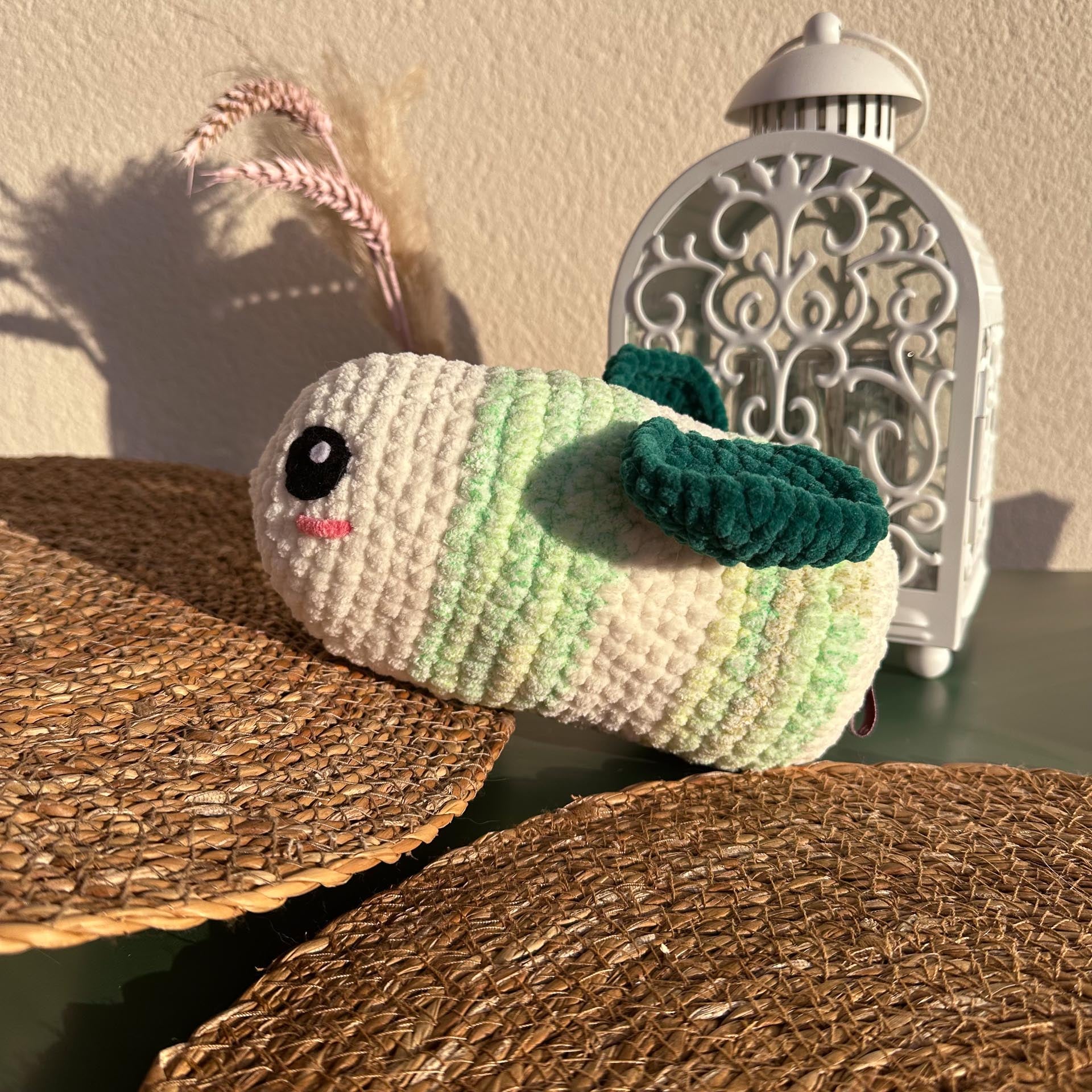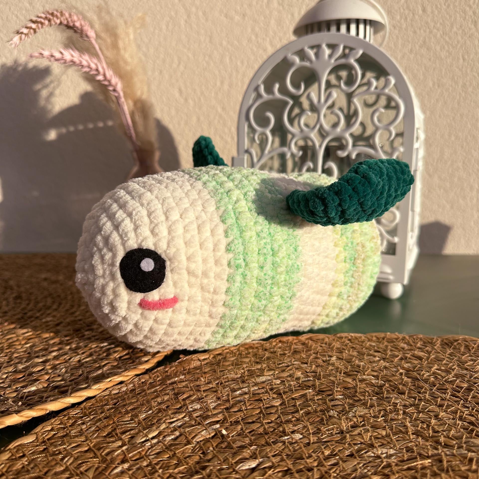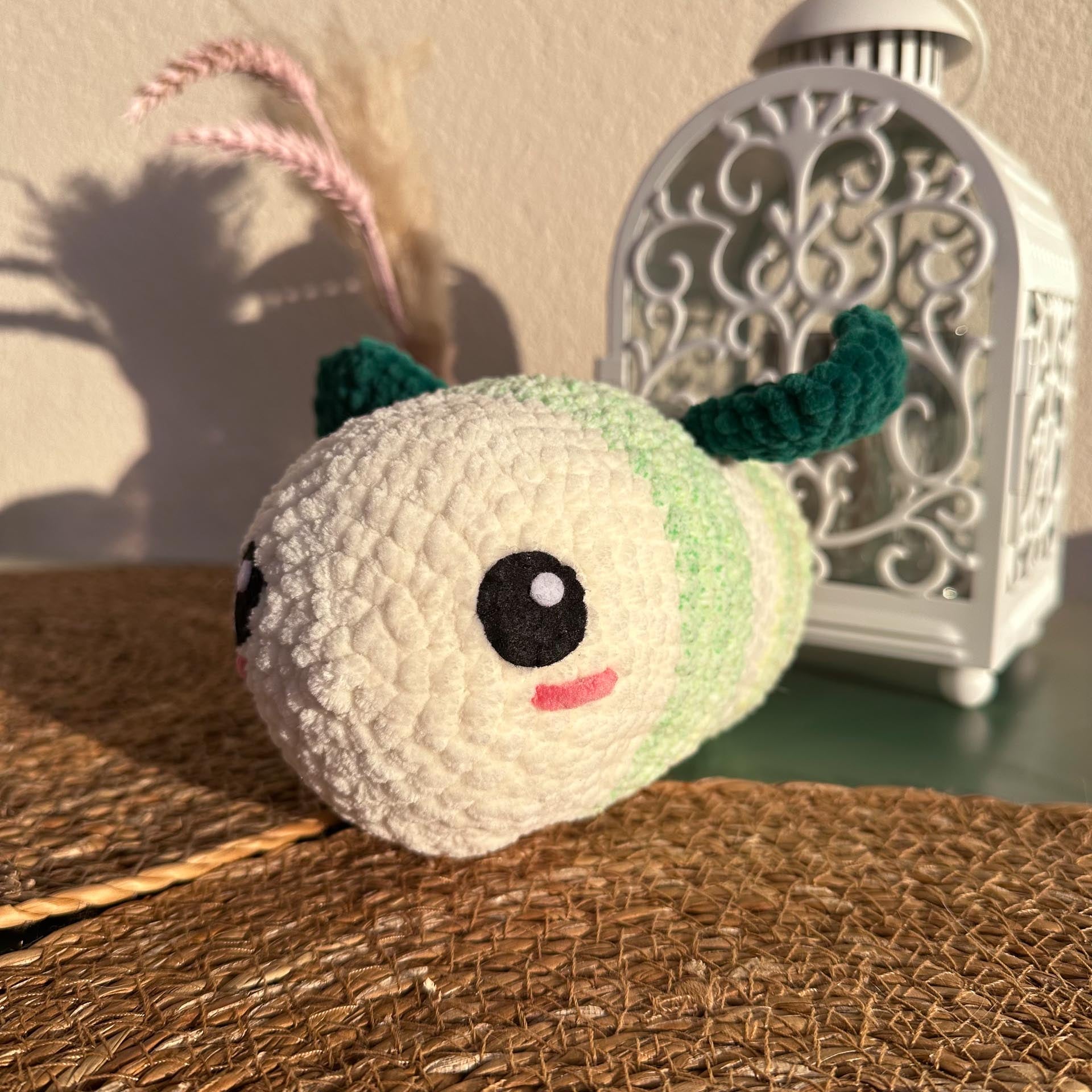 Grande abeille aussi originale que mignonne. Une peluche toute douce au corps écru et végétal, aux ailes vertes et aux petits yeux noirs cousus.
