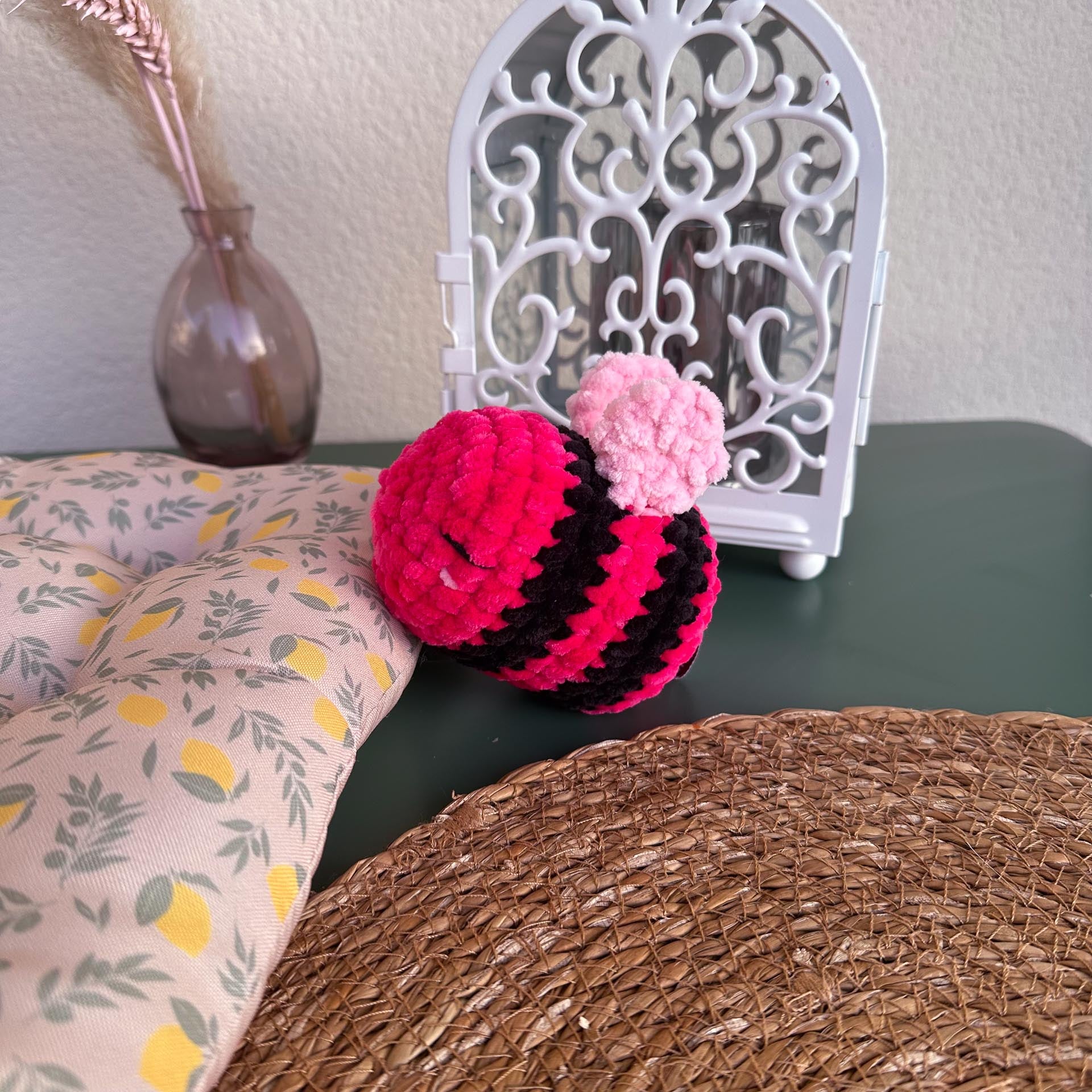 Petite abeille aussi originale que mignonne. Une peluche toute douce au corps rose foncé et noir, aux ailes rose clair et à la frimousse brodée de fil noir.