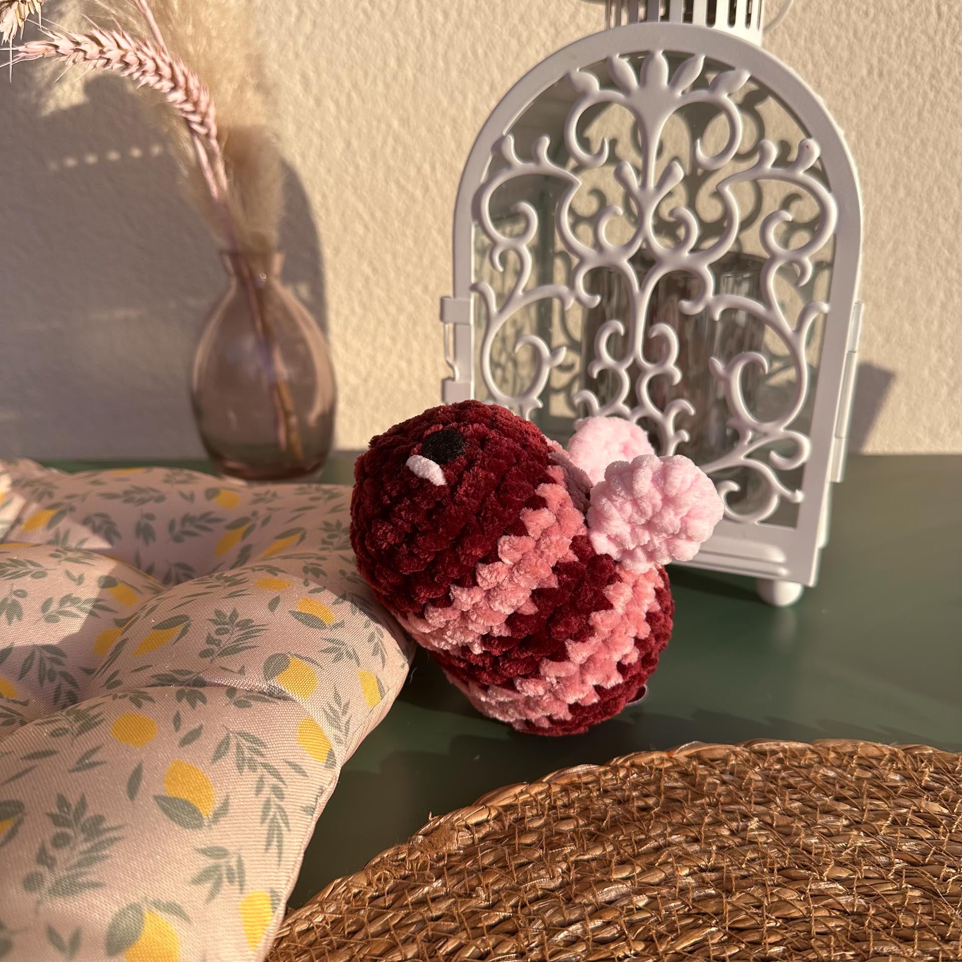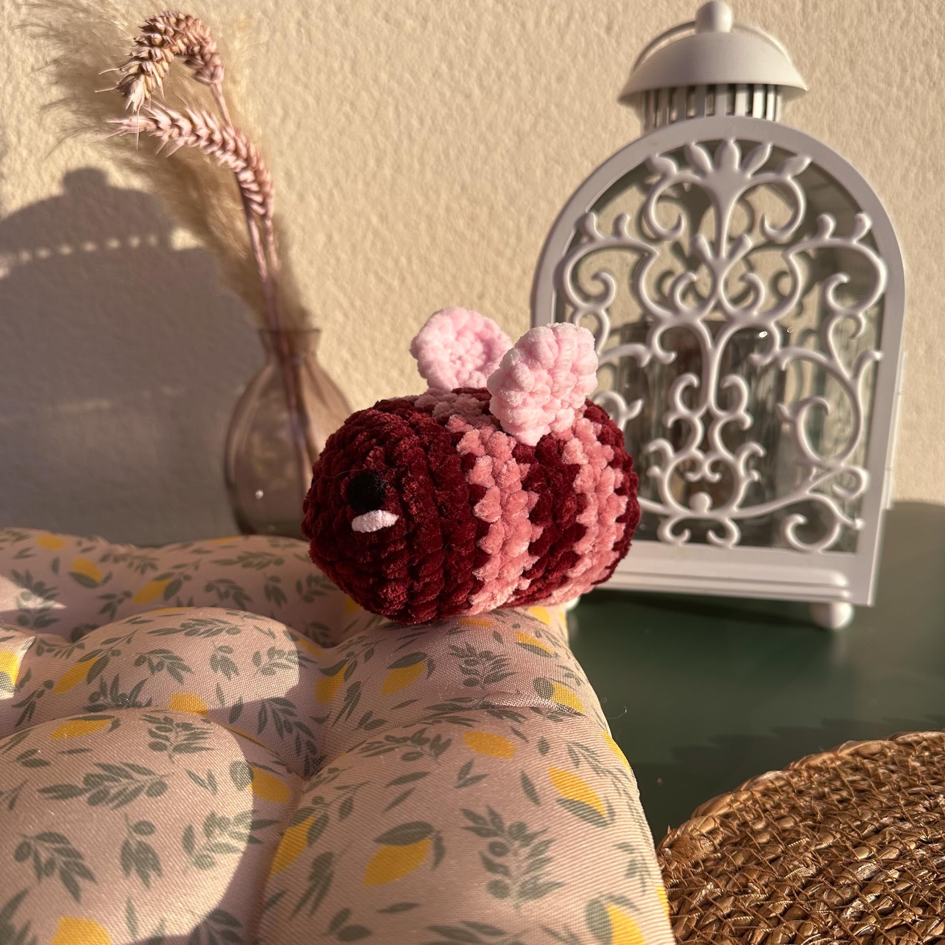 Petite abeille aussi originale que mignonne. Une peluche toute douce au corps violet et rose, aux ailes roses et à la frimousse brodée de fil noir.