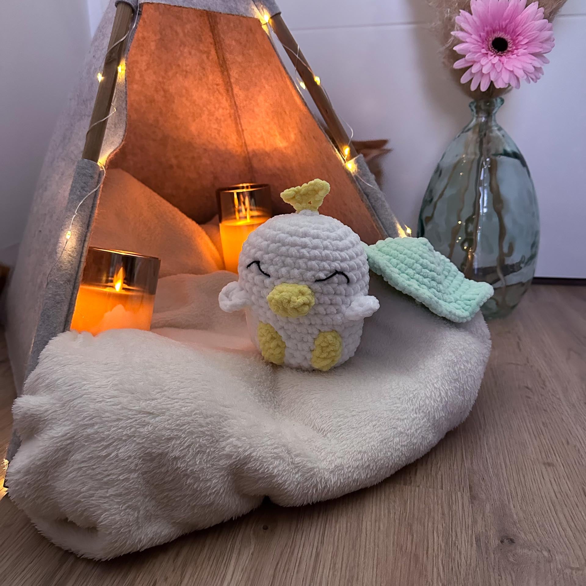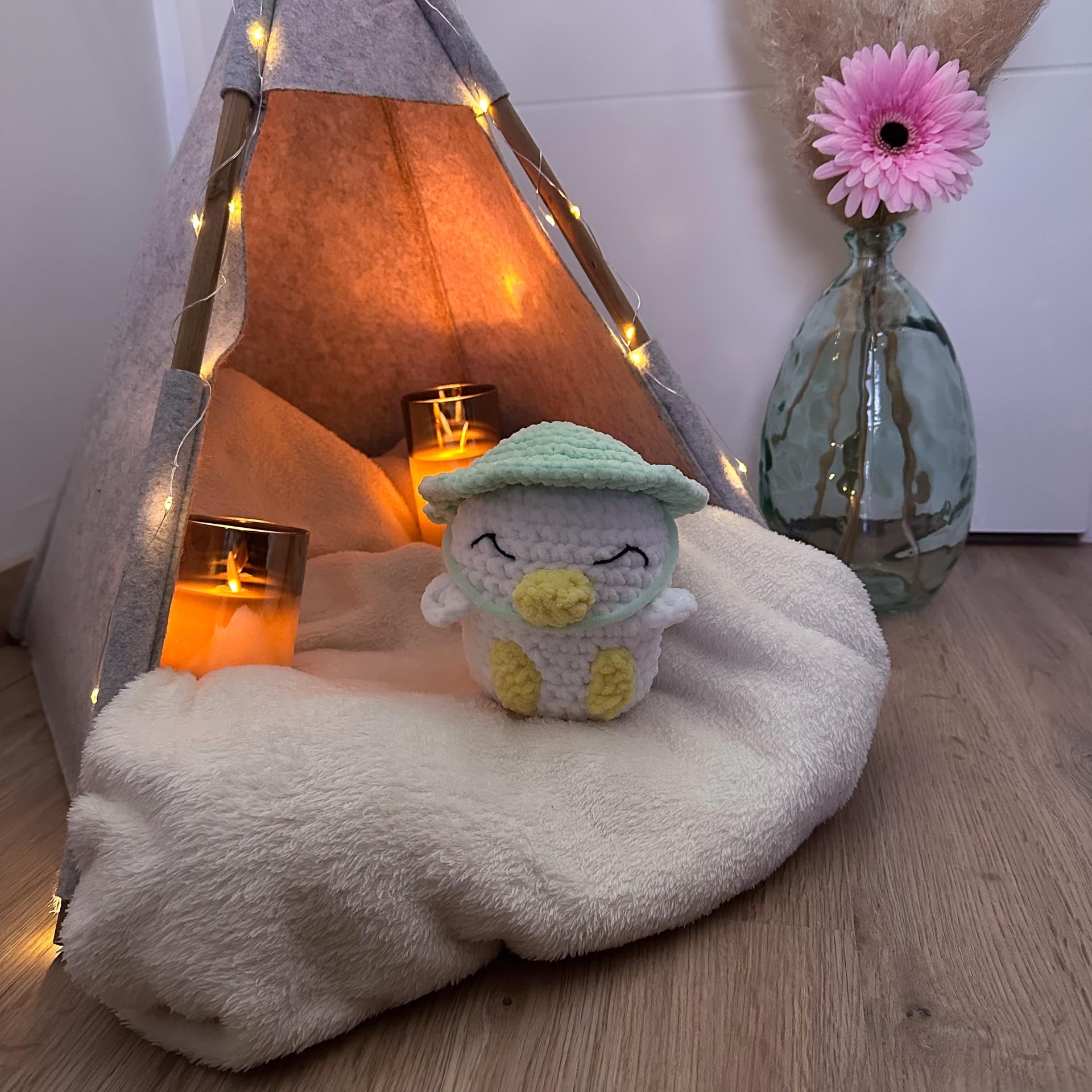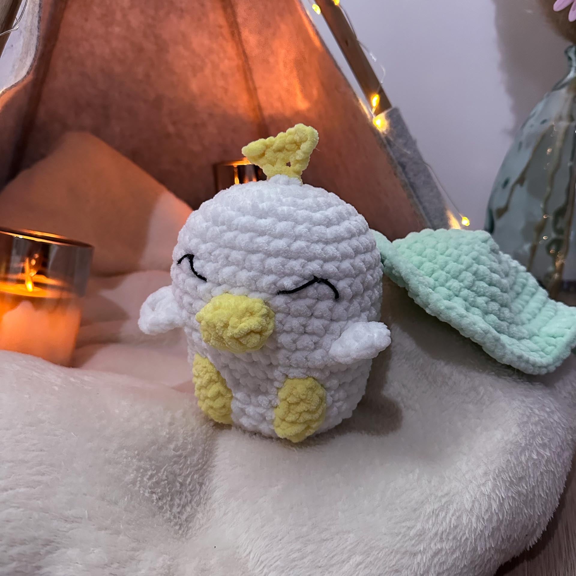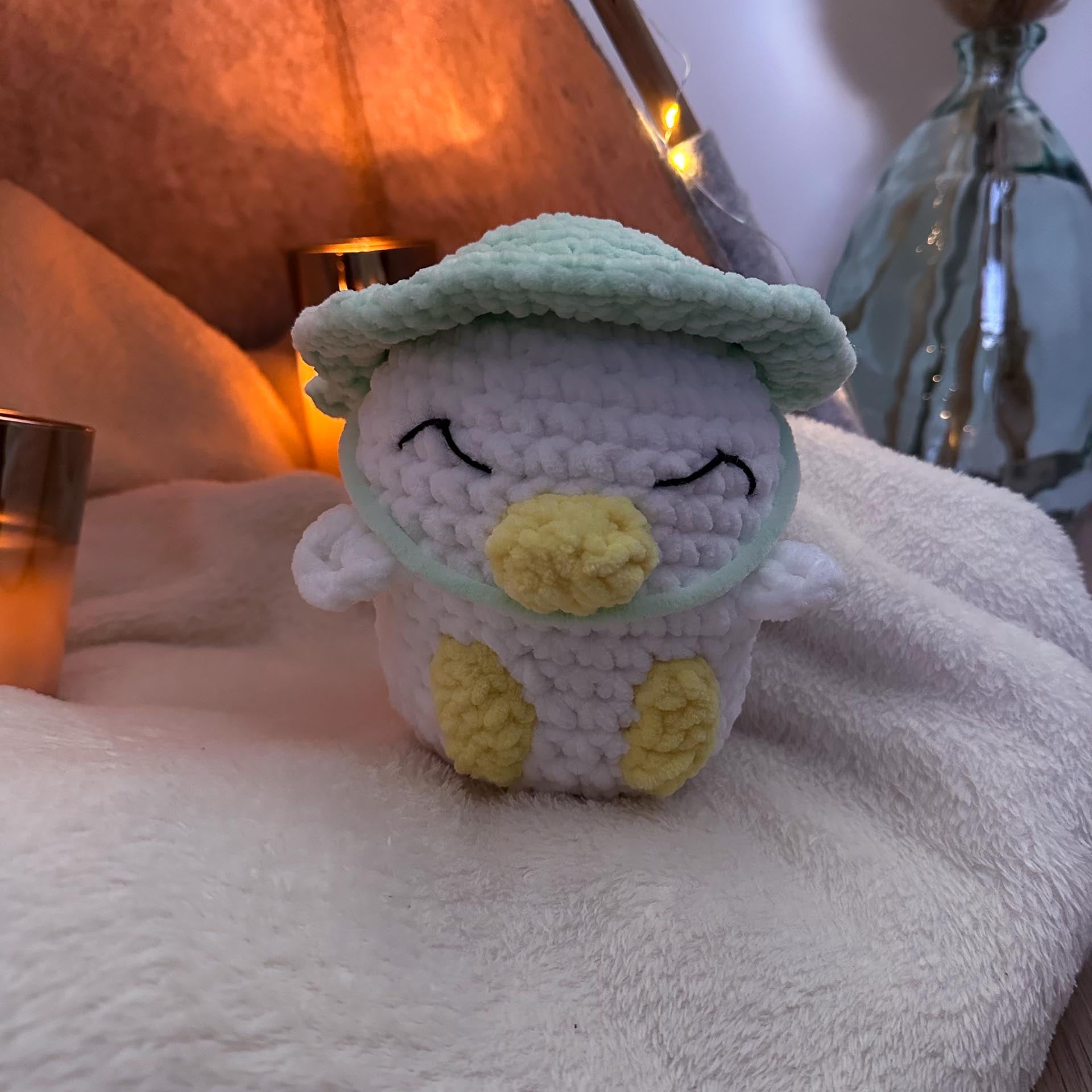Une peluche canard pleine de caractère, arborant un bob stylé pour une touche fun et unique. Parfaite pour des câlins ou comme compagnon déco, elle fera sourire tout le monde !
