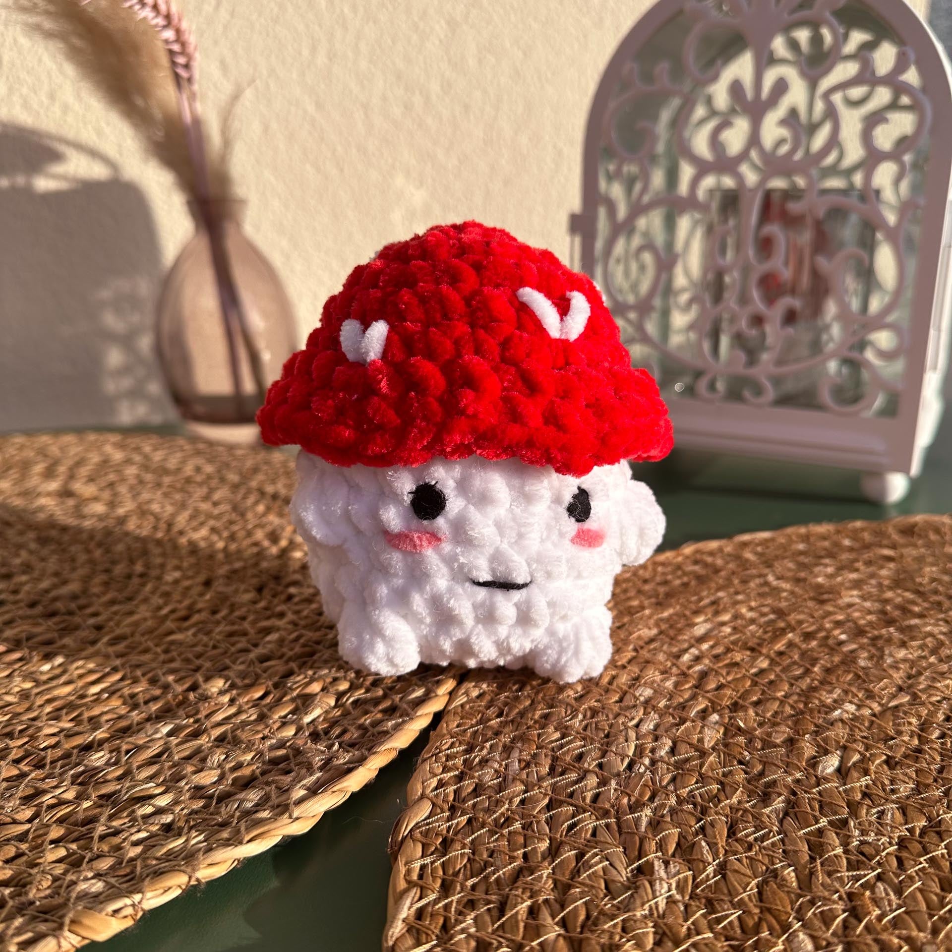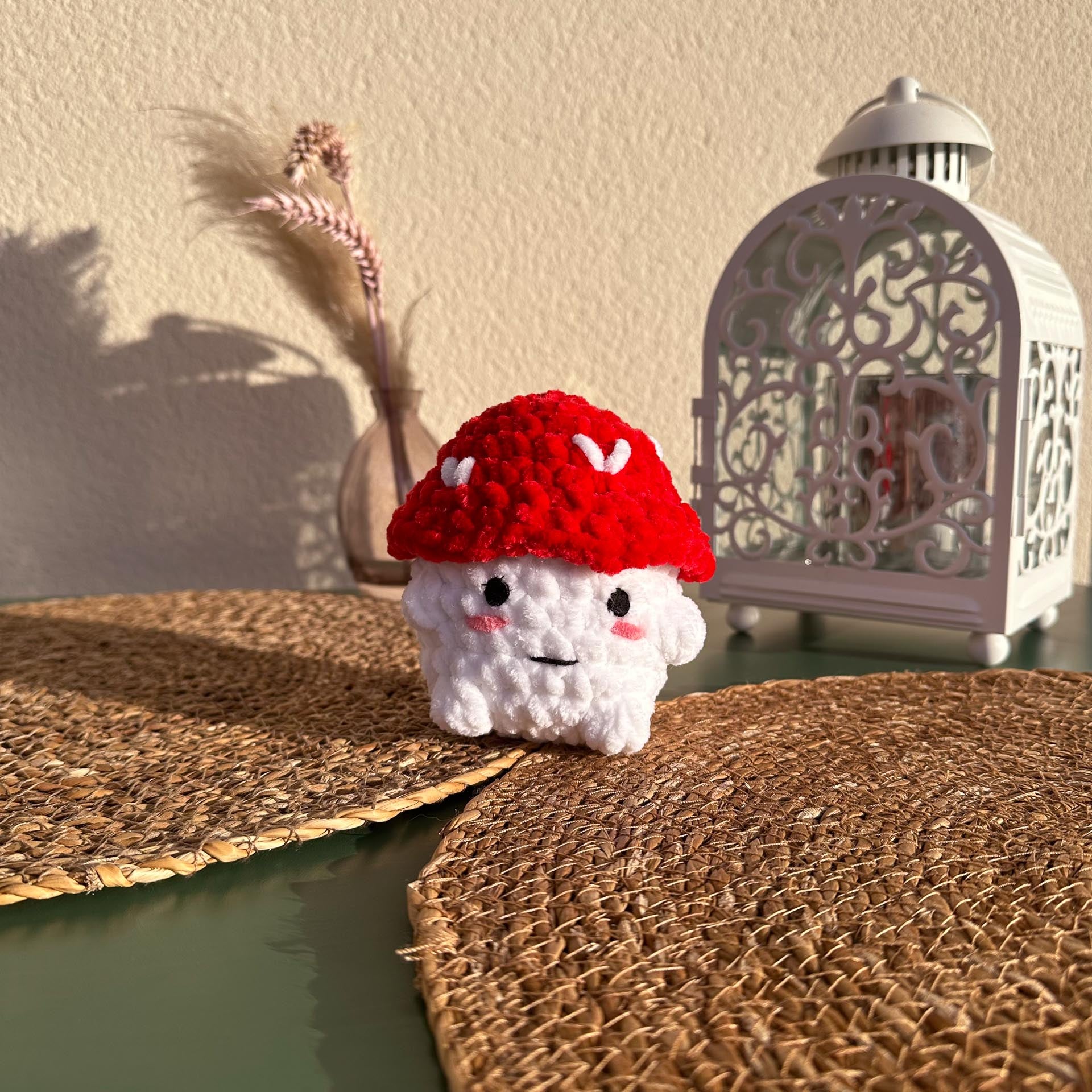 Une peluche champignon adorable et douce, ornĂ©e de dĂ©tails cute avec ses petits cĹ“urs.Â