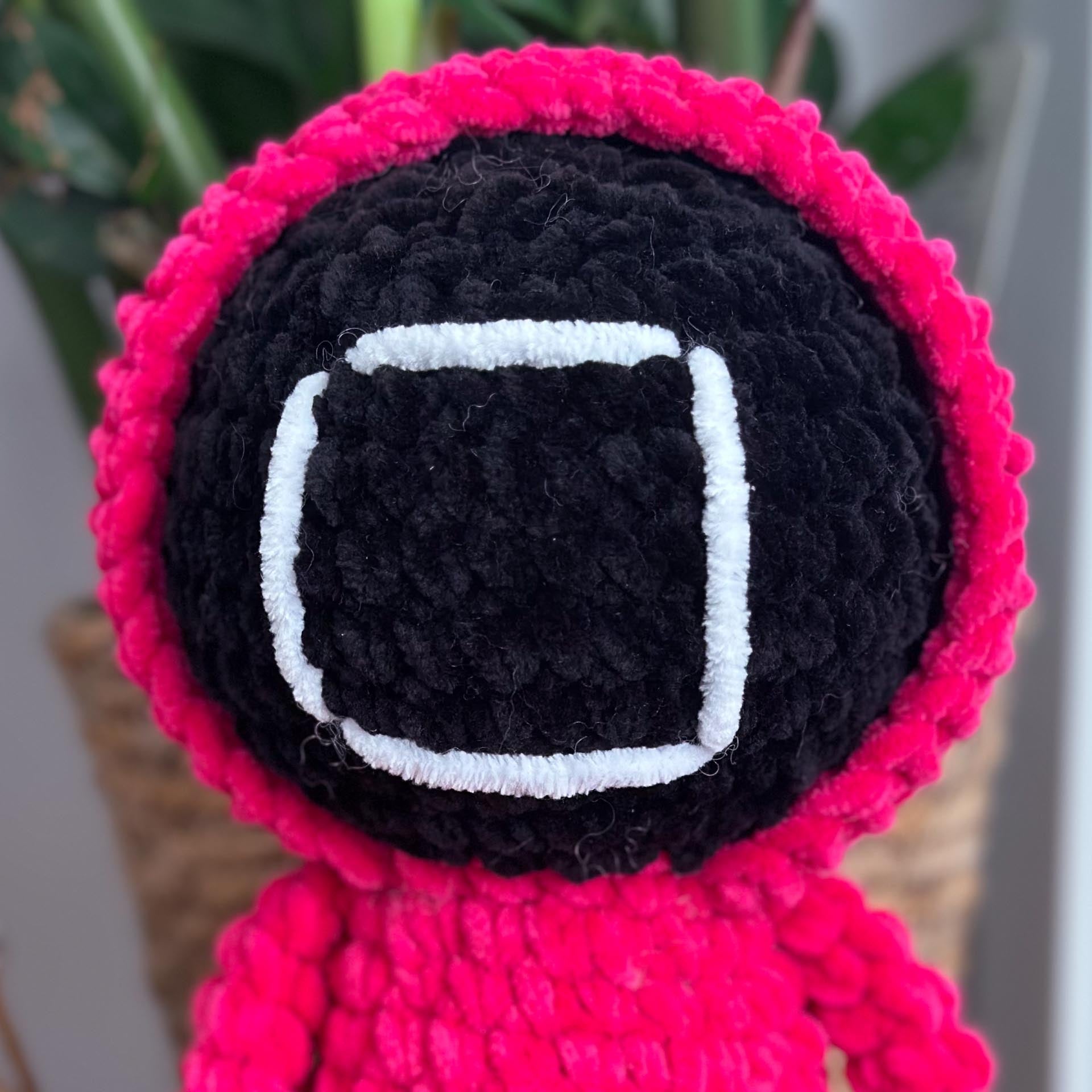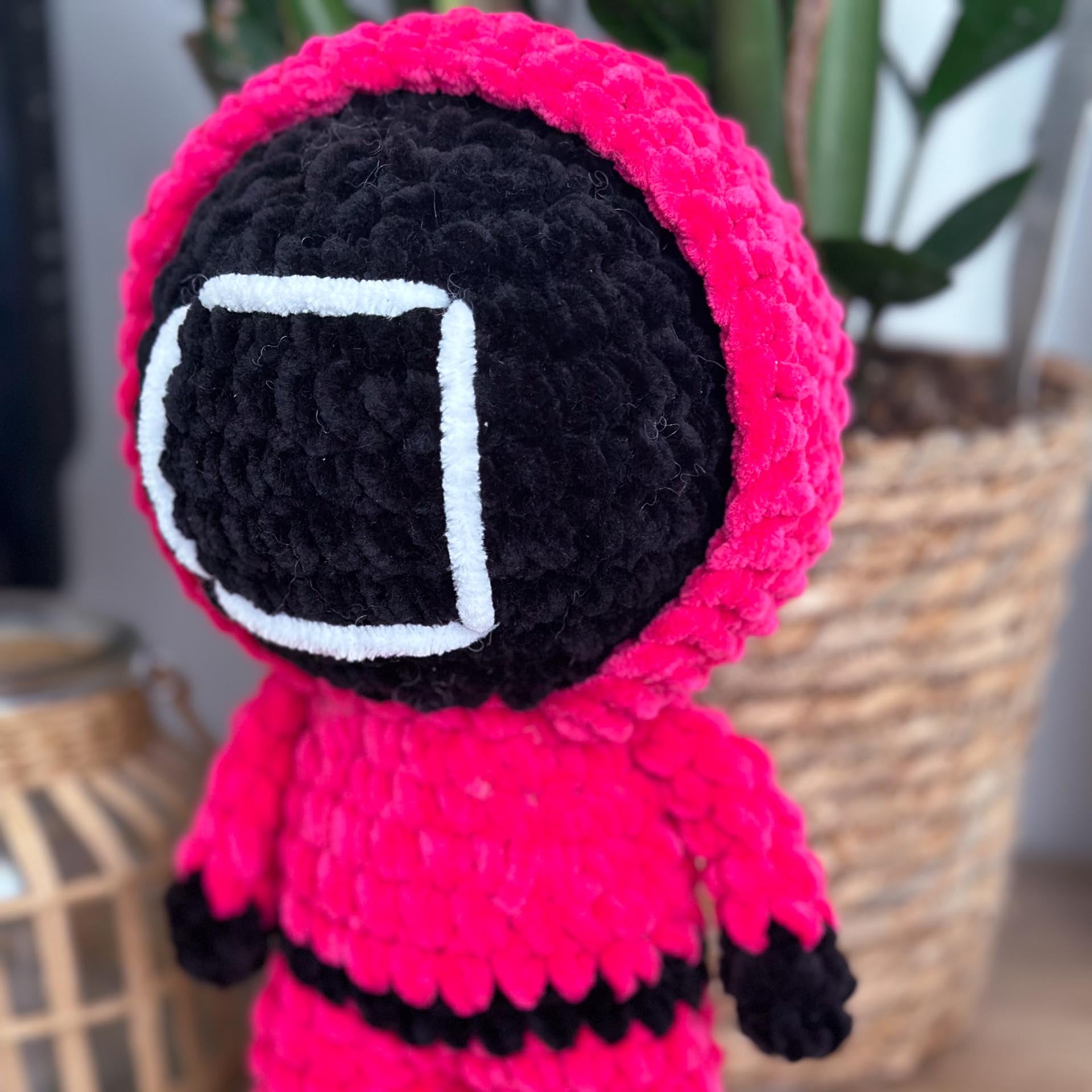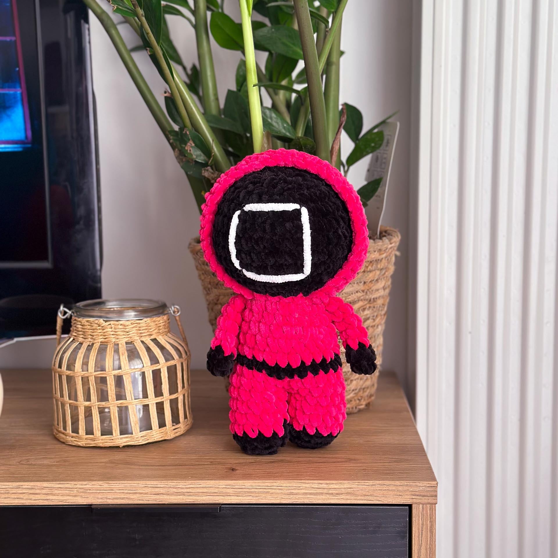 Une peluche garde de Squid Game, fidèle au personnage avec sa tenue rouge et son masque iconique. Parfaite pour les fans de la série, elle ajoute une touche originale et mystérieuse à votre collection !