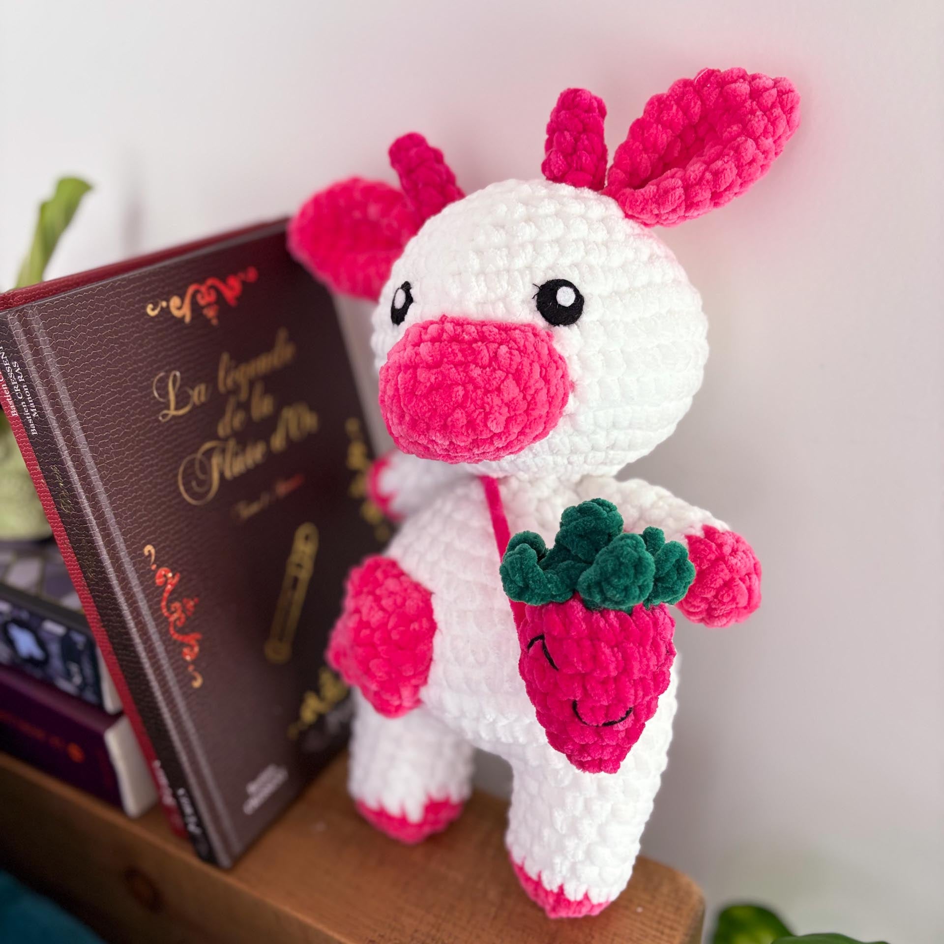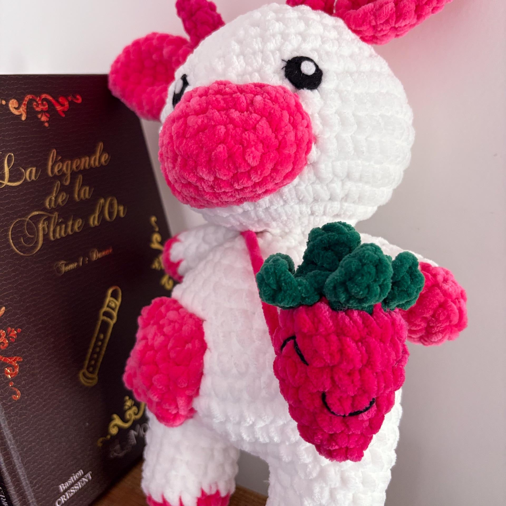 Une peluche vache fraise unique et gourmande, mêlant la douceur d'une vache moelleuse à un design parsemé de taches façon biscuits. Parfaite pour les câlins ou comme compagnon fun, elle séduira les amoureux d'originalité !